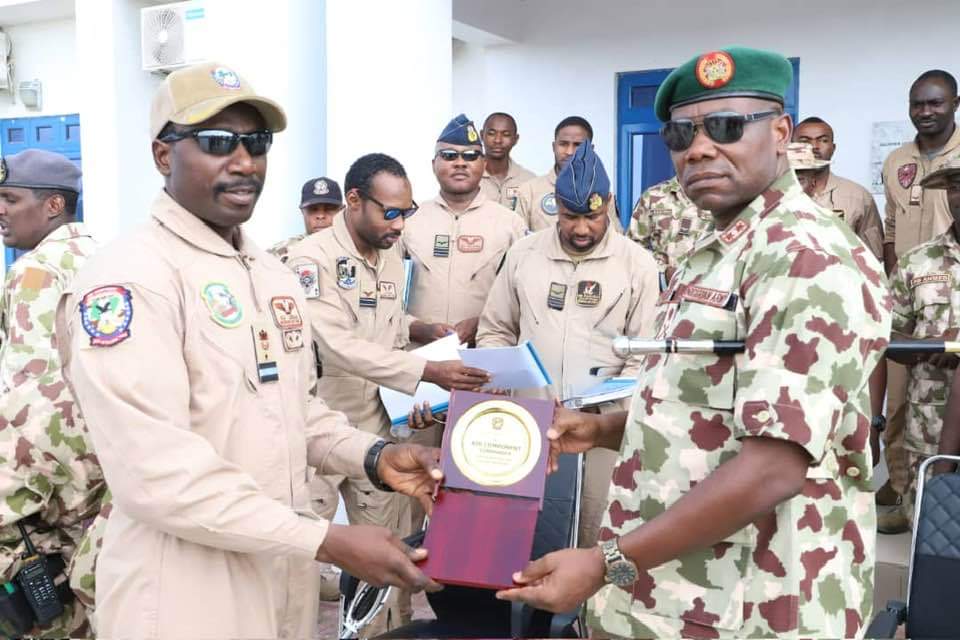 NAN reports that on arrival at the Air Force Base, the theatre commander was received by Air Commodore G.I. Jibia, the Air Component Commander OPHK, alongside the Commander, 105 Composite Group, Air Commodore EP Bindul.