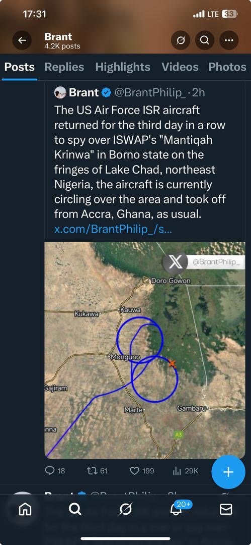 The social media handler had posted that the United States Air Force ISR aircraft, which has flown missions over the Lake Chad basin for three consecutive days, again returned on Saturday to conduct surveillance on ISWAP’s “Mantiqah Krinwa” in northern Borno. The aircraft, as with previous sorties, was tracked taking off from Accra, Ghana.