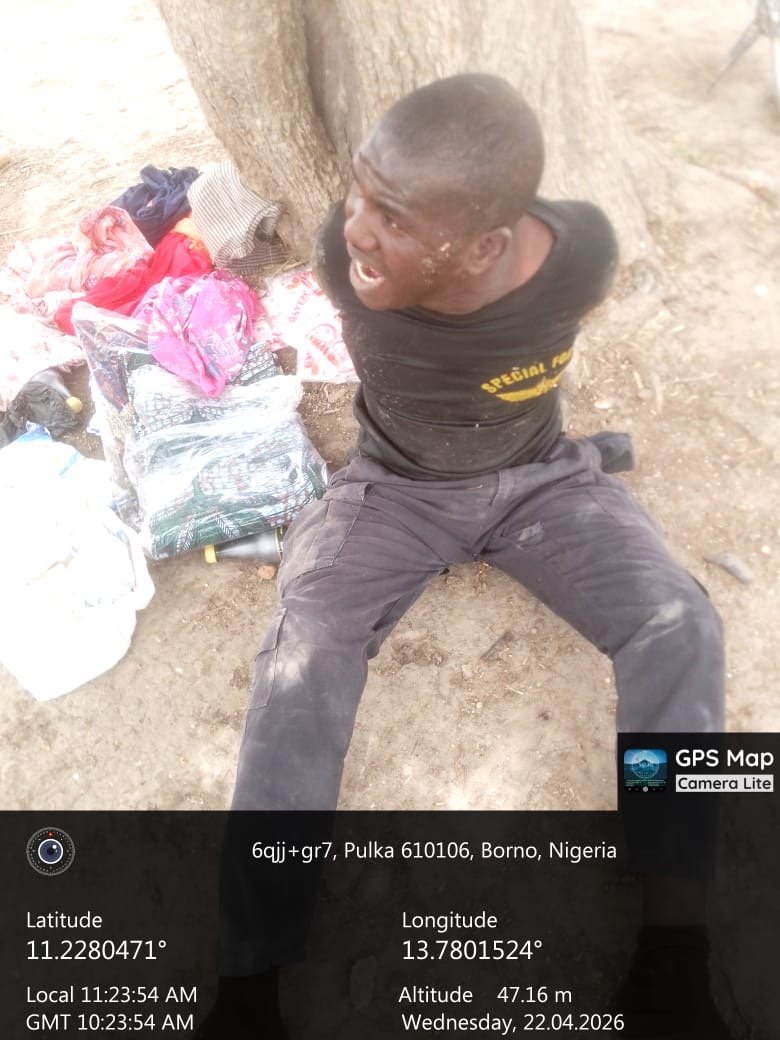 Security sources told Zagazola Makama that the suspect was apprehended at about 11:23 a.m. on April 22 by troops of 192 Battalion (Mechanised) deployed at E Company, Forward Operating Base (FOB) Pulka, under Operation Hadin Kai.