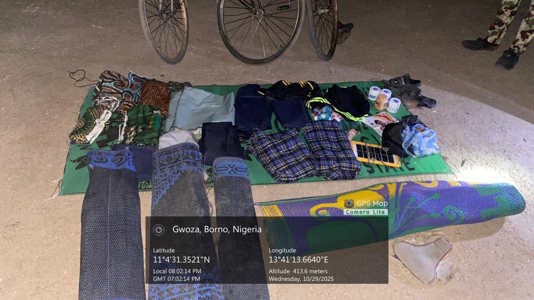 During a subsequent exploitation of the area, the troops recovered three bicycles, six pieces of wrappers, four containers of Vaseline, one torchlight, one small solar panel, four mats, six pieces of fabric, two blankets, one sachet of salt, one sachet of white seasoning, two pairs of shorts, one white singlet, one portion of bush meat and two phone cases.