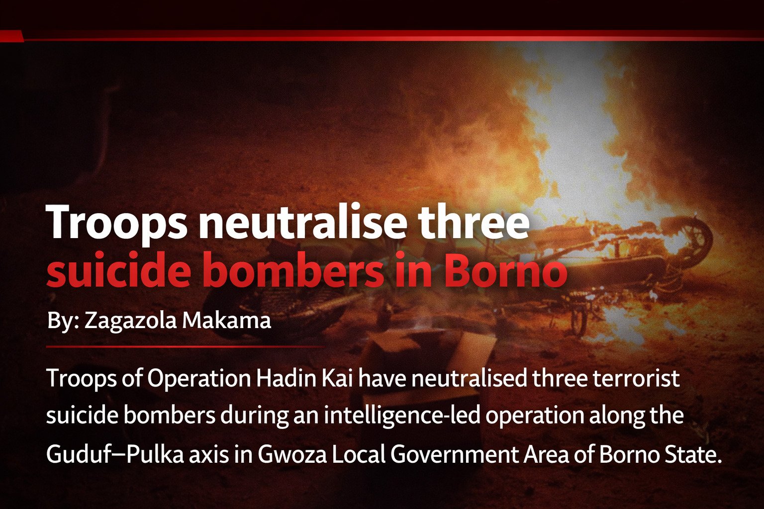 Troops of Operation Hadin Kai have neutralised three terrorist suicide bombers during an intelligence-led operation along the Guduf–Pulka axis in Gwoza Local Government Area of Borno State.
