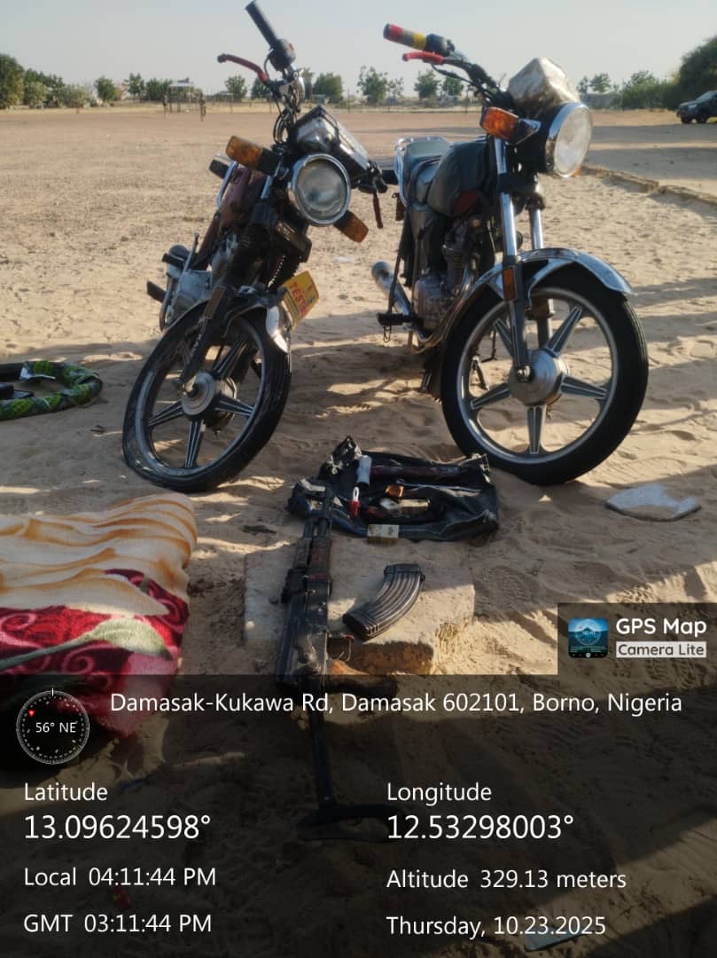 Sources stated that the troops responded with superior firepower, forcing the terrorists to flee in disarray. Reinforcements led by the Commanding Officer of the Battalion later exploited the scene, recovering two motorcycles, one AK-47 rifle, five blankets, three praying mats, a spare motorcycle tyre and two gallons of engine oil.