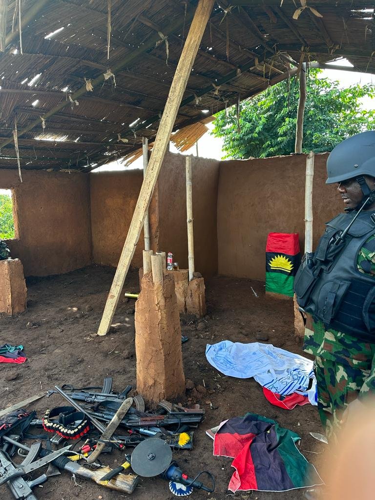 The troops captured one of the fleeing fighters and recovered five AK 47 Rifles, three Pump Action Semi Automatic Rifles, one G3 Rifle and one single barrel gun. Other items recovered, include Live Cartridges, Electric Saw, Machetes, an Axe and IPOB flag.
