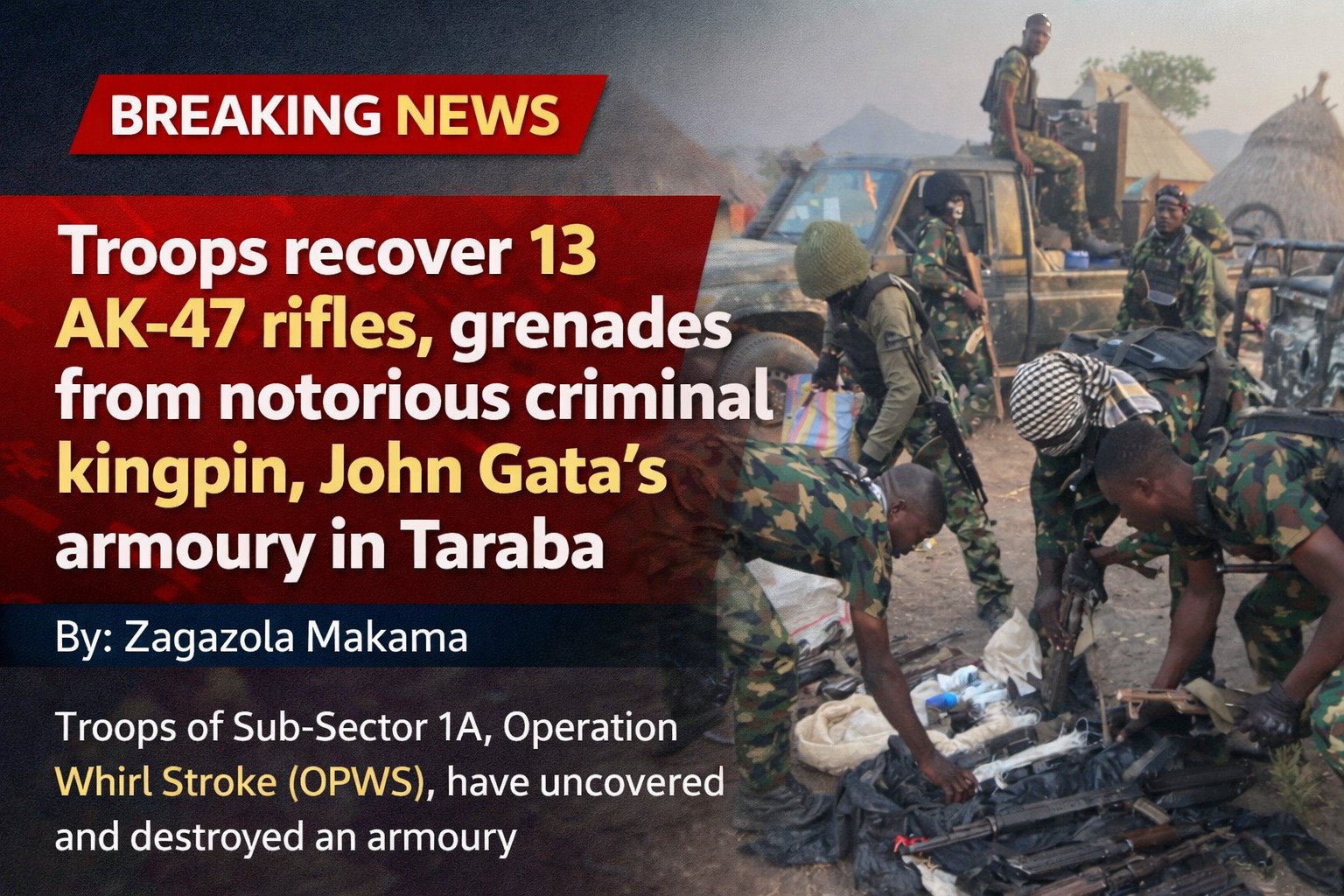 Troops recover 13 AK-47 rifles, grenades from notorious criminal kingpin, John Gata’s armoury in Taraba