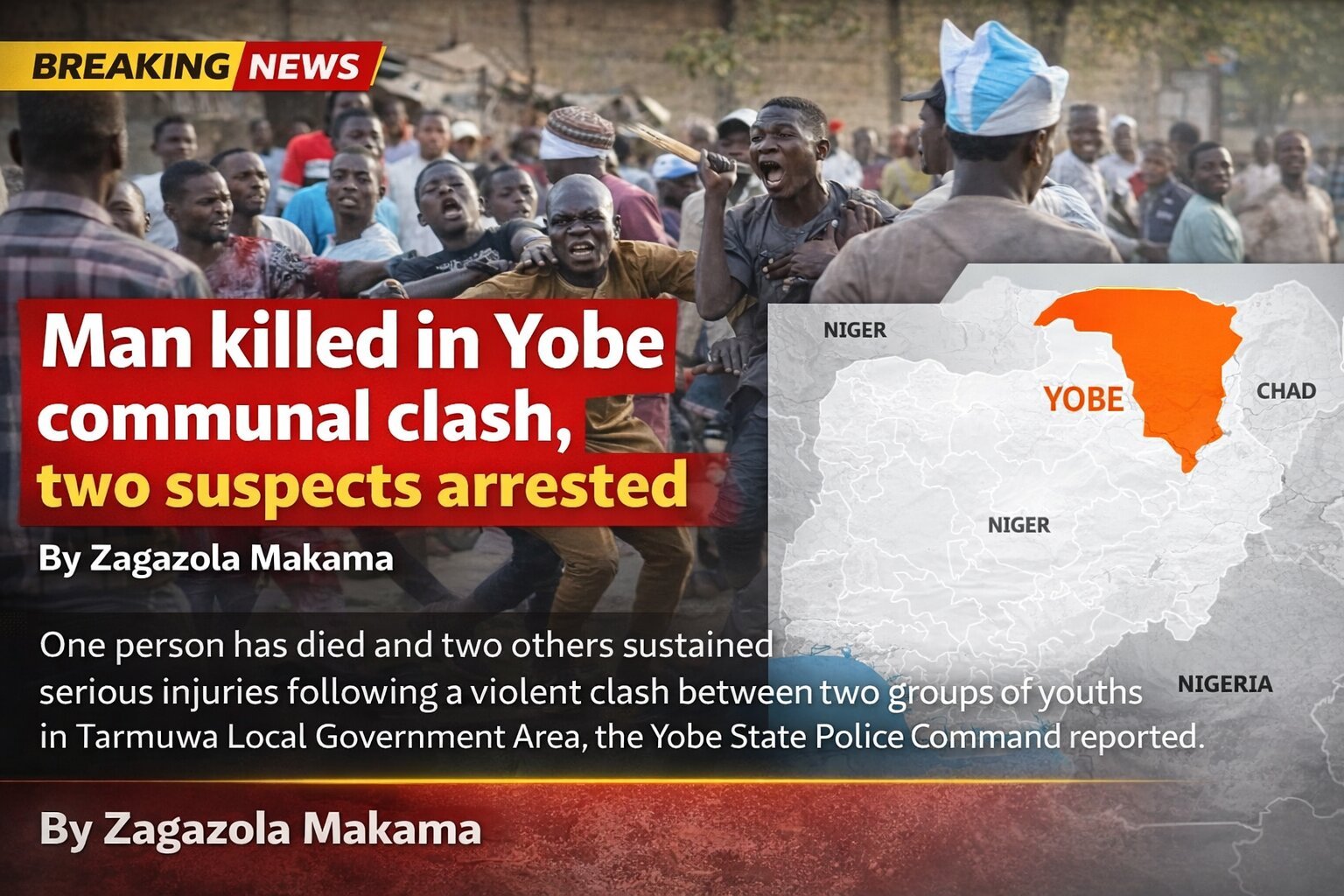| Man killed in Yobe communal clash, two suspects arrested By: Zagazola Makama One person has died and two others sustained serious injuries following a violent clash between two groups of youths in Tarmuwa Local Government Area, the... |