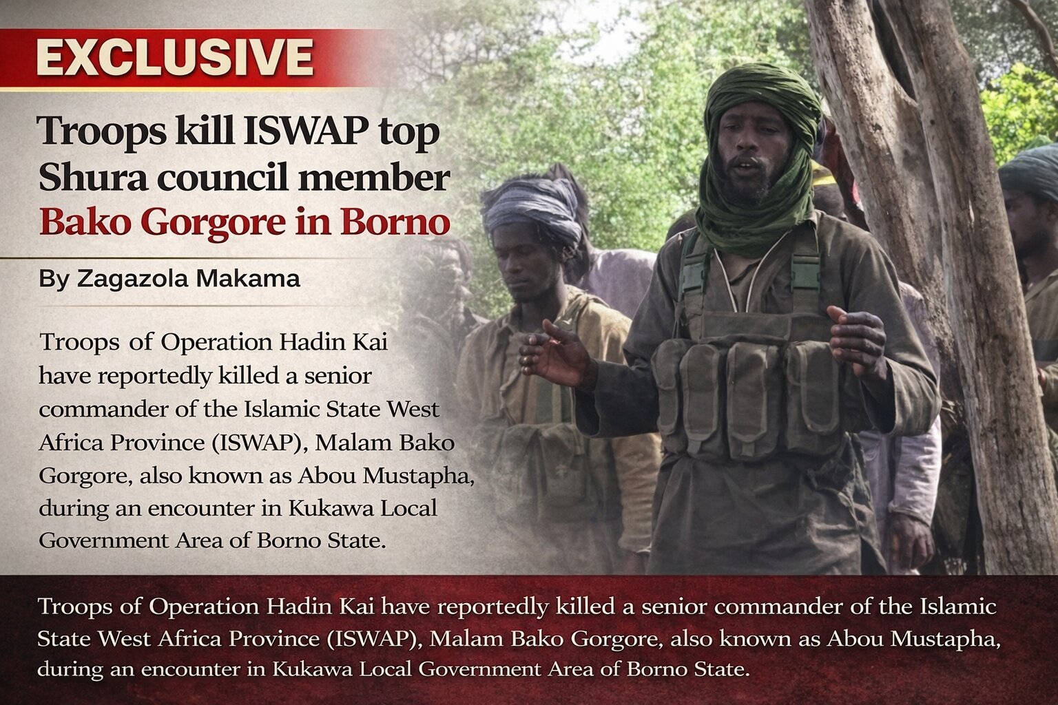 Troops of Operation Hadin Kai have reportedly killed a senior commander of the Islamic State West Africa Province (ISWAP), Malam Bako Gorgore, also known as Abou Mustapha, during an encounter in Kukawa Local Government Area of Borno State.