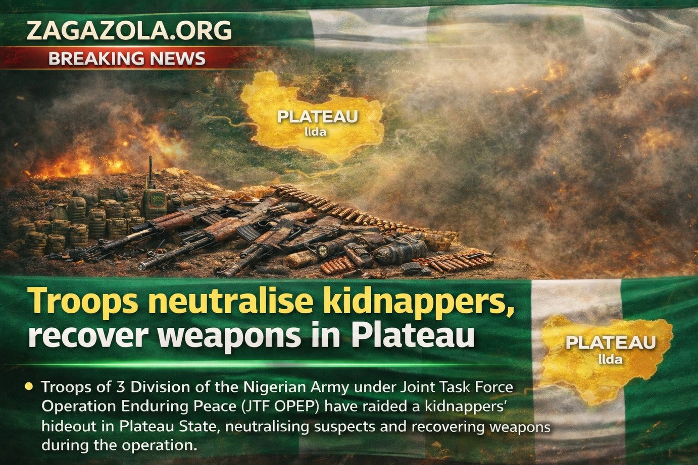 Troops of 3 Division of the Nigerian Army under Joint Task Force Operation Enduring Peace (JTF OPEP) have raided a kidnappers’ hideout in Plateau State, neutralising suspects and recovering weapons during the operation.