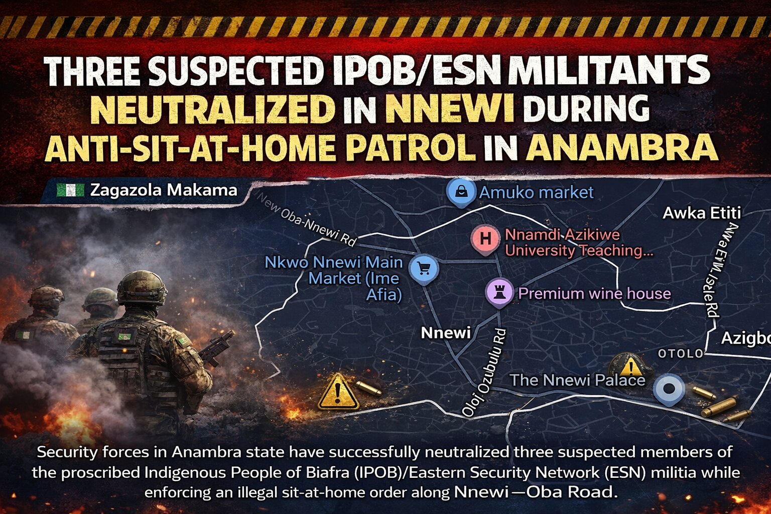 - Three suspected IPOB/ESN militants neutralized in Nnewi during anti-sit-at-home patrol in Anambra 6 minutes ago